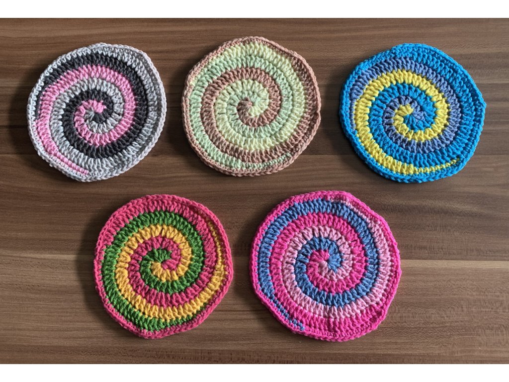 Háčkované podložky pod skleničky ve veselých barvách.